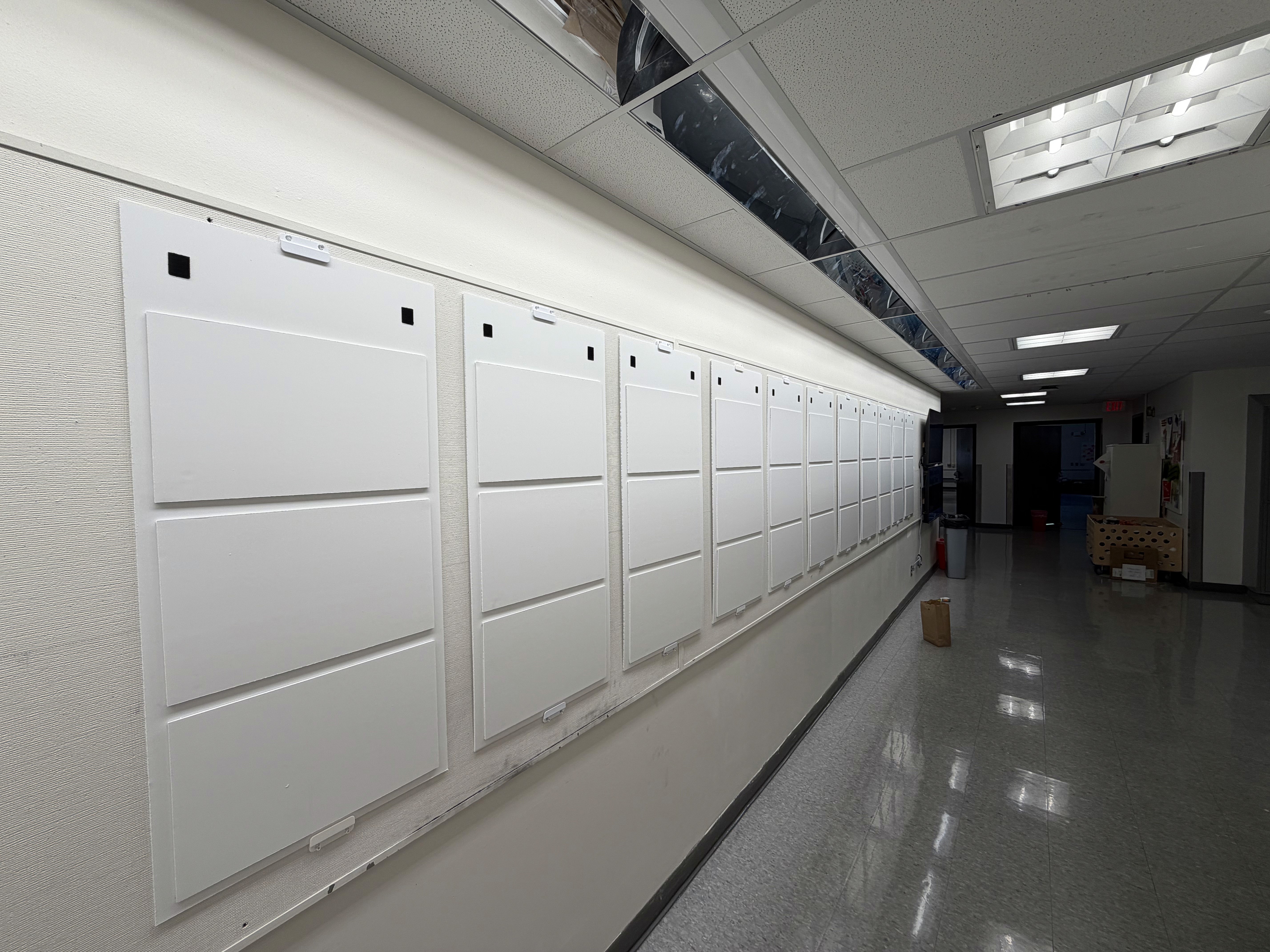 Since Ohio State did not have an established pin-up system, this solution was designed to integrate seamlessly with the university’s existing pinboards and printing infrastructure. The system is supported by push pins and a custom 3D-printed bracket assembly. Each panel was designed for easy interchangeability and optimized for tabloid-format printing to ensure simple setup and maintenance.